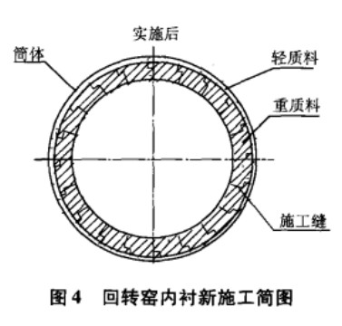 經過與原料廠家、大修部門對該問題的共同探討,較確定將原有兩條澆注料之間的直縫施工修改為有錯臺的施工縫,阻擋在高溫條件下高溫炭粉由施工縫進入輕質料層。回轉窯內襯新施工簡圖見圖4。此項措施較明顯地改善了內襯的使用狀況,次采用就使回轉窯內襯的使用壽命提高到了440天以上。