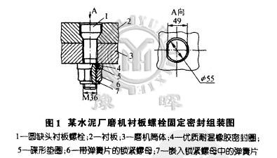 所以水泥廠從國(guó)外引進(jìn)生料磨、水泥球磨機(jī)等多種設(shè)備投入運(yùn)轉(zhuǎn)。其襯板固定螺栓采用了帶彈簧片的鎖緊螺母和碟形墊圈加優(yōu)質(zhì)耐溫像膠密封圈進(jìn)行緊固和密密封等新型結(jié)構(gòu),使用多年來(lái)一直很理想,如圖1所示。