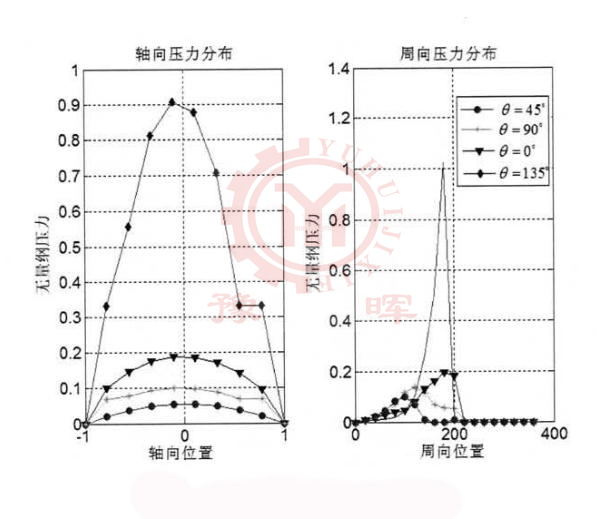 由不同旋轉(zhuǎn)角度下的球磨機(jī)橢圓軸處的油膜厚度分布情況我們可以知道,隨著橢圓的長(zhǎng)軸圍繞主軸軸心做逆時(shí)針運(yùn)轉(zhuǎn),此時(shí)的動(dòng)靜壓軸處油膜厚度也會(huì)發(fā)生一定的變化,而較小油膜的厚度則是先增加后減小然后在增大的變化。同時(shí)我們還可以了解到球磨機(jī)油膜厚度會(huì)有兩個(gè)較低谷出現(xiàn),這些低谷則意味著動(dòng)壓油楔的產(chǎn)生,同時(shí)此區(qū)域也是我們所稱的動(dòng)壓力區(qū)。