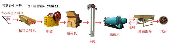 這套生產線有振動給料機、顎式破碎機、細碎機、球磨機、提升機、振動篩和皮帶輸送機等設備組合而成。